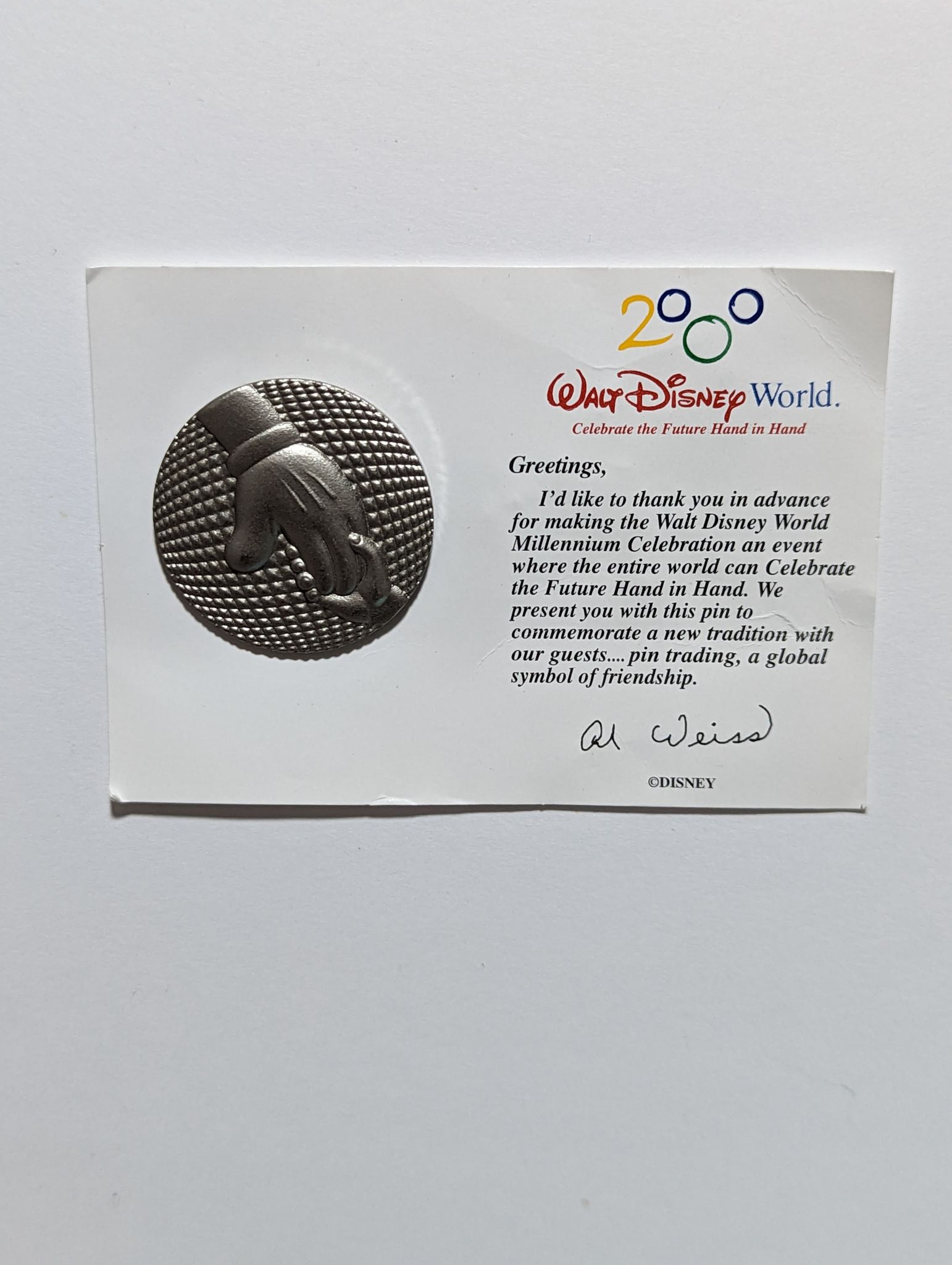 All silver/pewter; Mickey's hand is holding a child's hand; ball background like Spaceship Earth EPCOT symbol. This pin was distributed on a small card to WDW cast only and is signed by WDW president Al Weiss. Text on the card reads, "Greetings, I'd like to thank you in advance for making the Walt Disney World Celebration an event where the entire world can Celebrate the Future Hand in Hand.