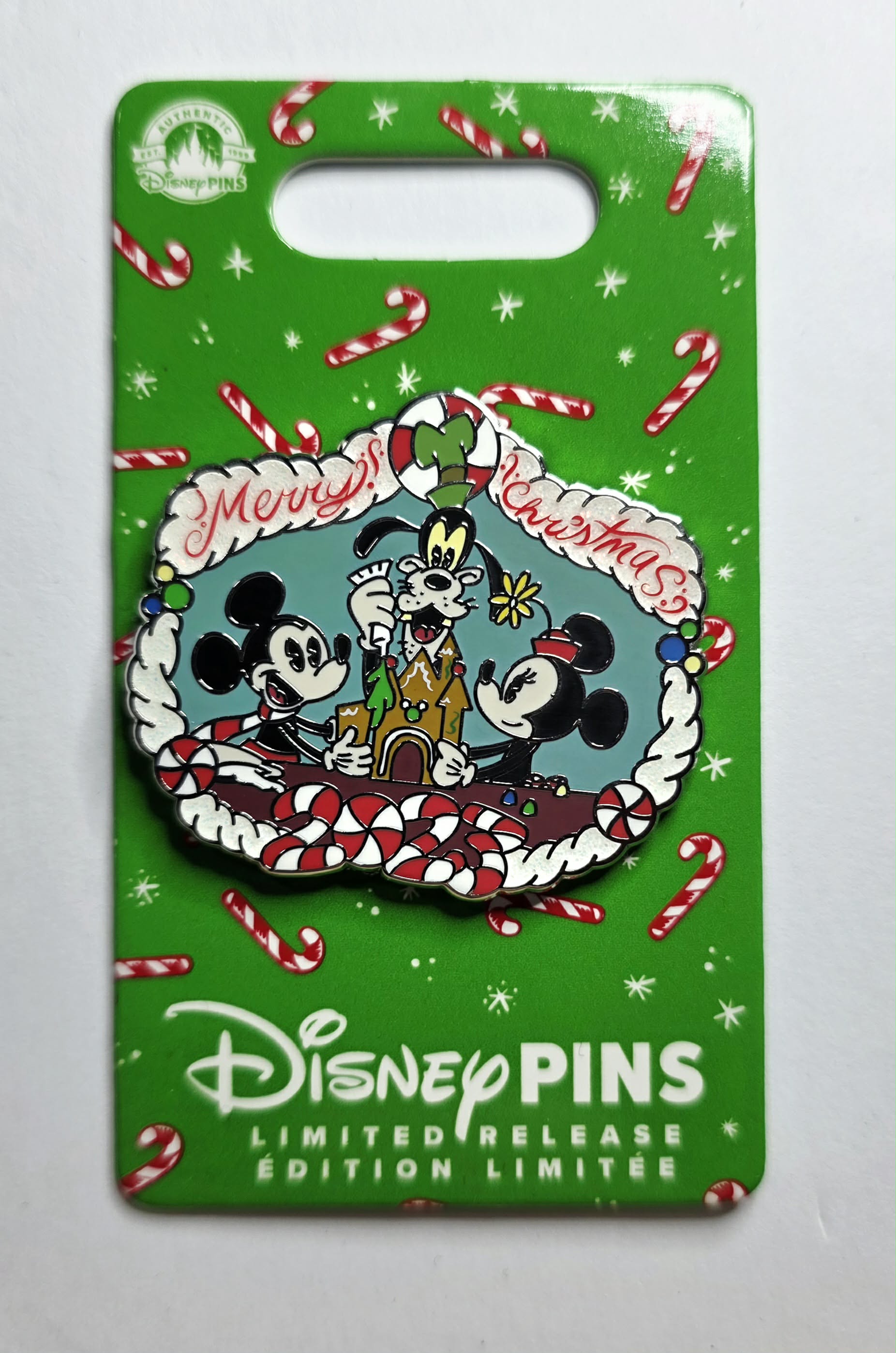 Christmas pin featuring Mickey Mouse, Minnie Mouse, and Goofy building a gingerbread house