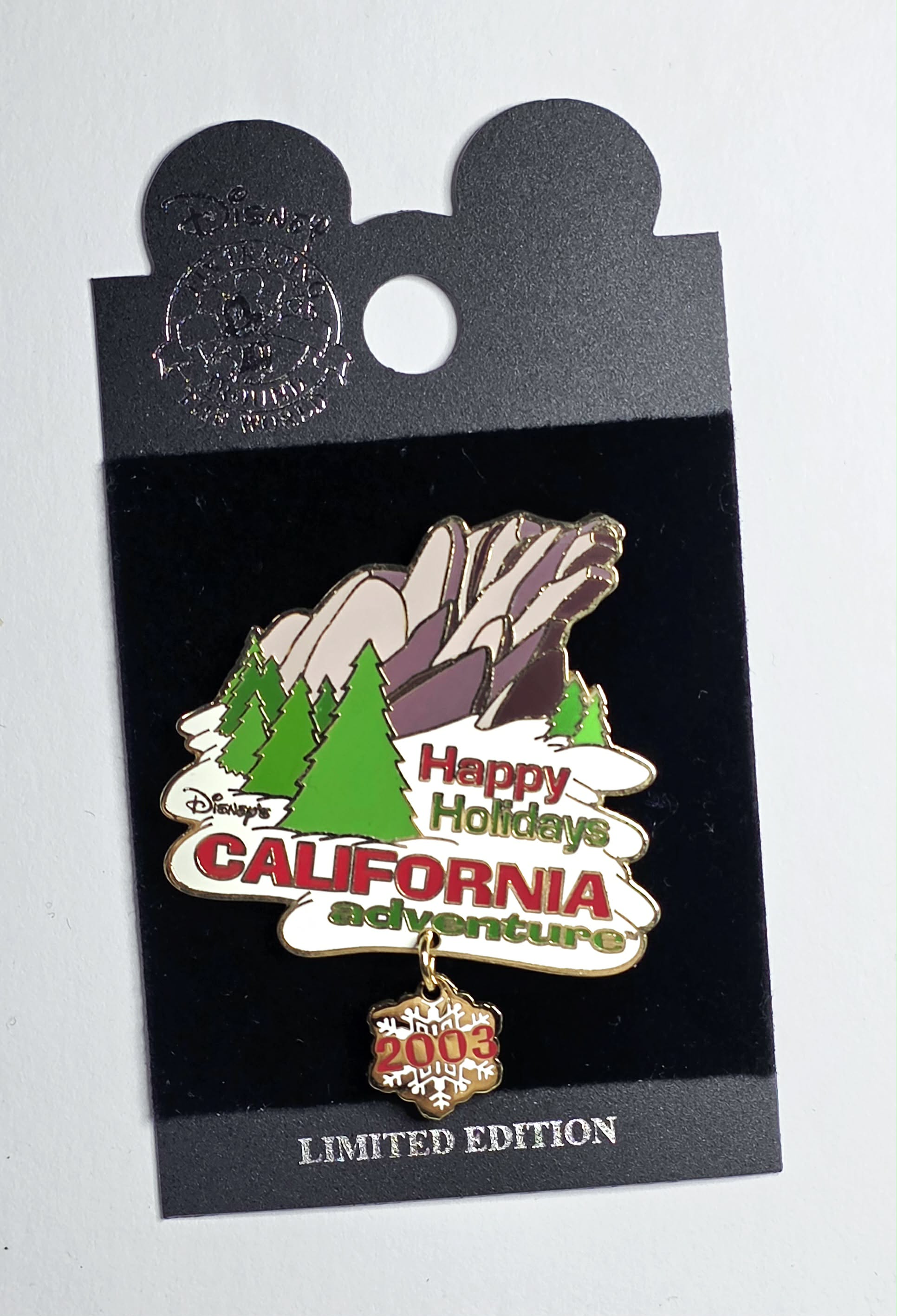 2003 holiday season at Disney California Adventure park. The pin features the Grizzly Peak area of the park, which is home to the Grizzly River Run attraction.