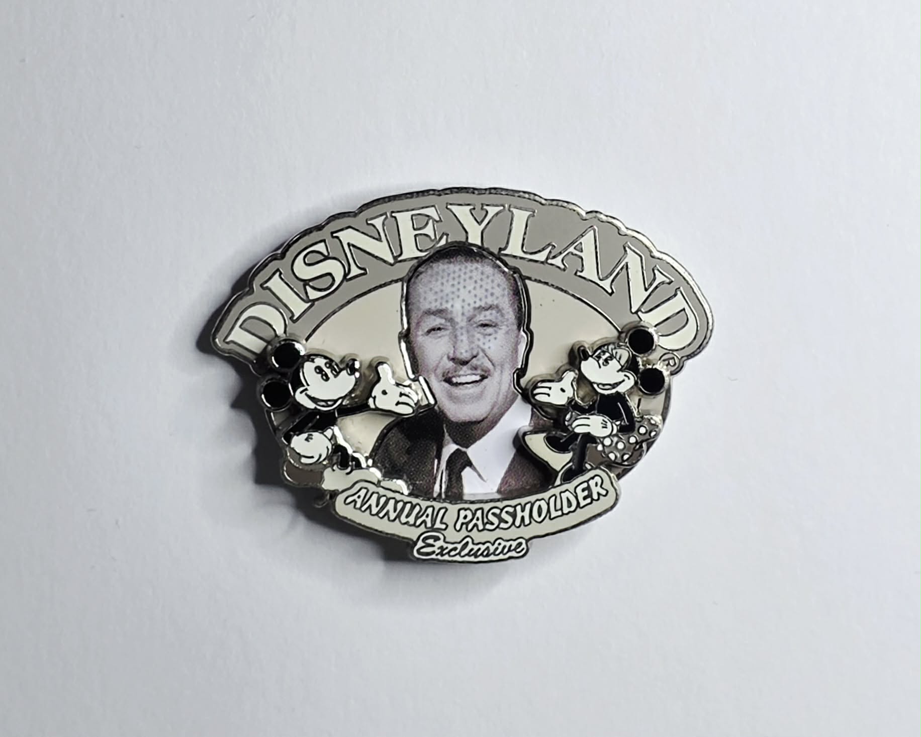 Disneyland Annual Passholder Exclusive pin featuring Walt Disney with Mickey and Minnie Mouse.