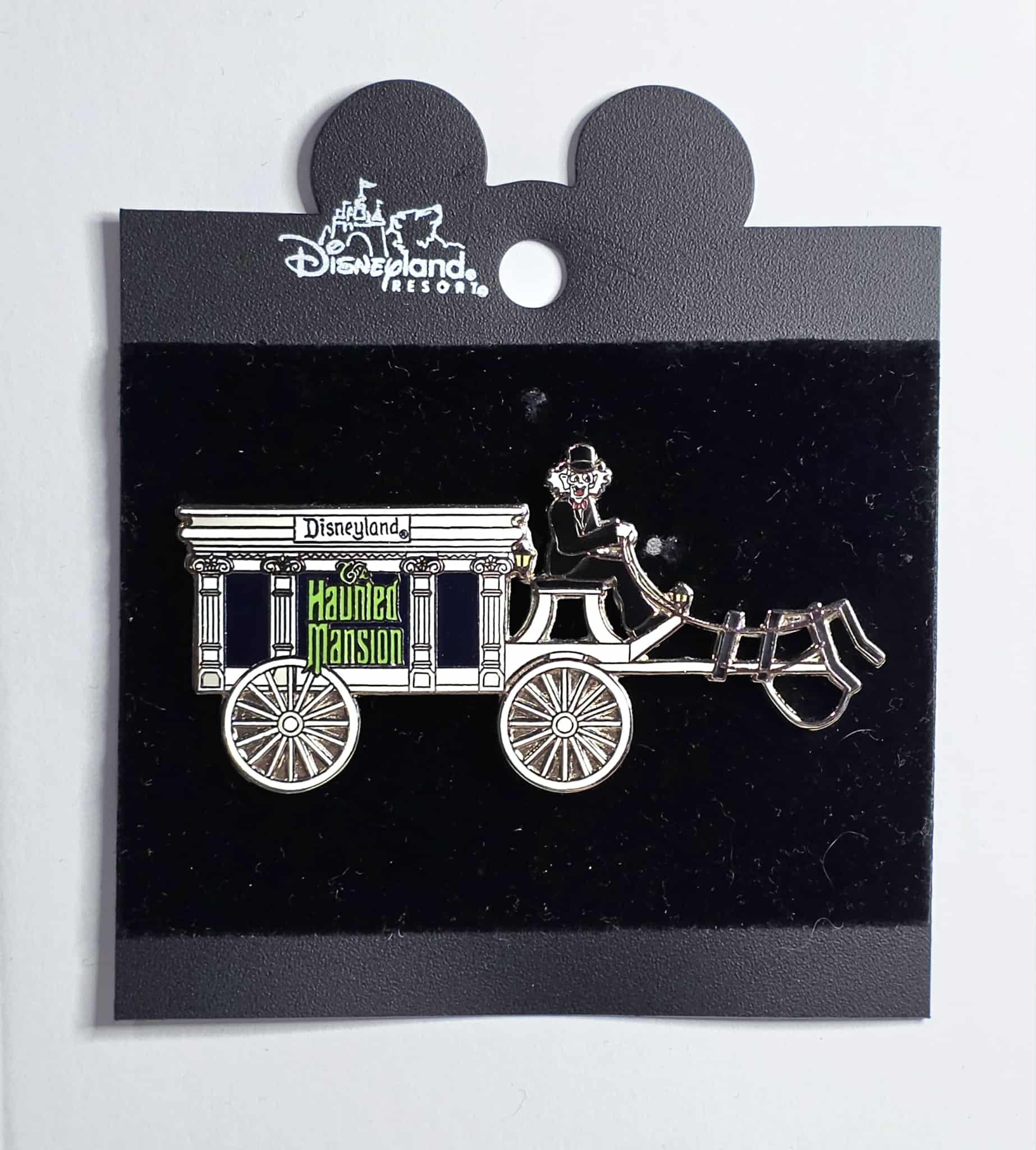 Disneyland Haunted Mansion Hearse pin, an exclusive and retired collectible. The pin features the ghost Ezra driving the iconic, horseless hearse found in the queue of the Haunted Mansion attraction
