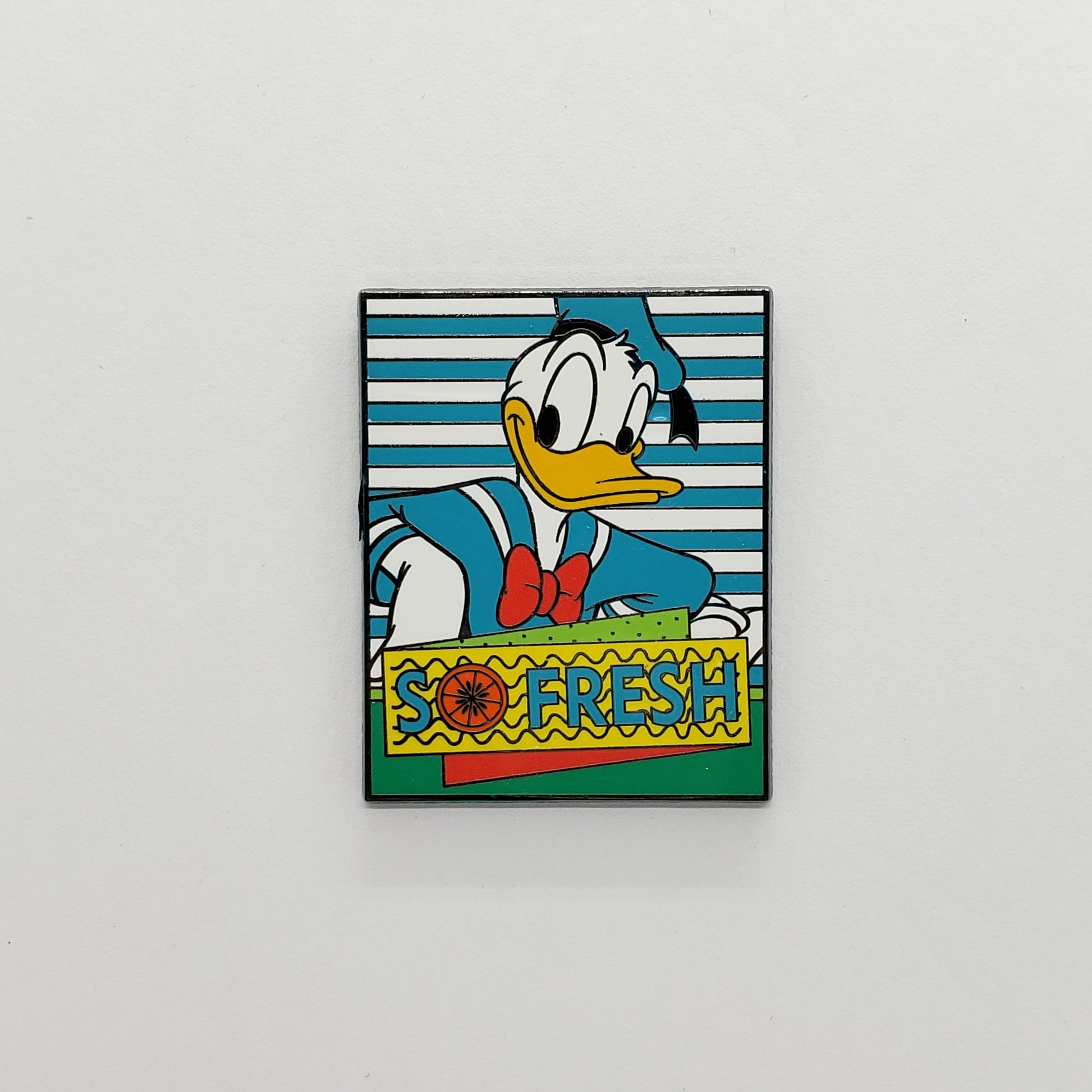 The Donald "So Fresh" pin from the DS Food Mystery group. This is one of two unknown "mystery" pins in the set. The rectangle pin shows Donald against a blue and white striped background. At the bottom of the pin reads "SO FRESH" in blue letters, with the "O" as an orange.