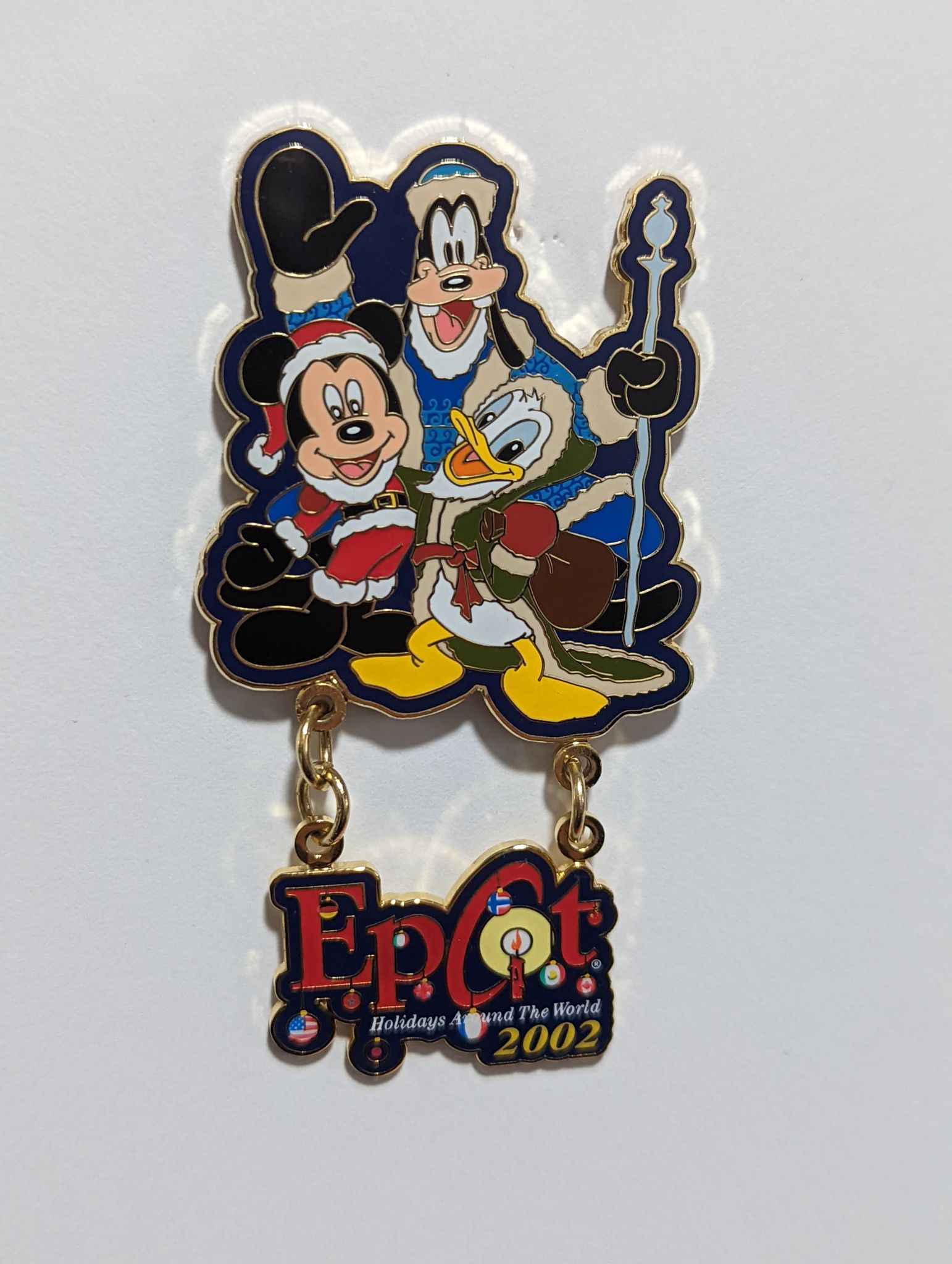 2002 Epcot Holidays Around the World dangle featuring Santa Mickey, Goofy and Donald. The dangle is the Epcot Holidays Around the World 2002 logo. It was exclusive to Epcot.