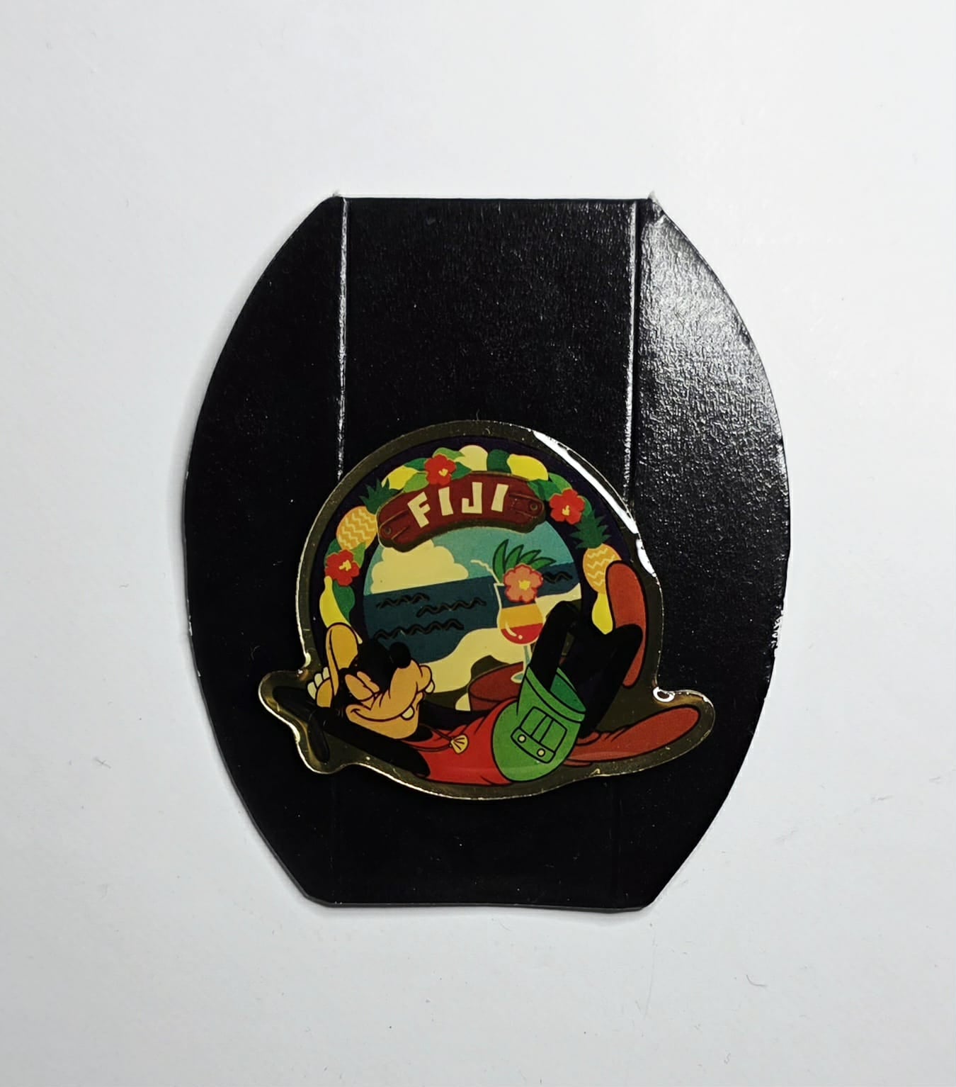 The pin features Goofy lying down, wearing green swim shorts and a red top, with a tropical background and the word "FIJI" displayed.