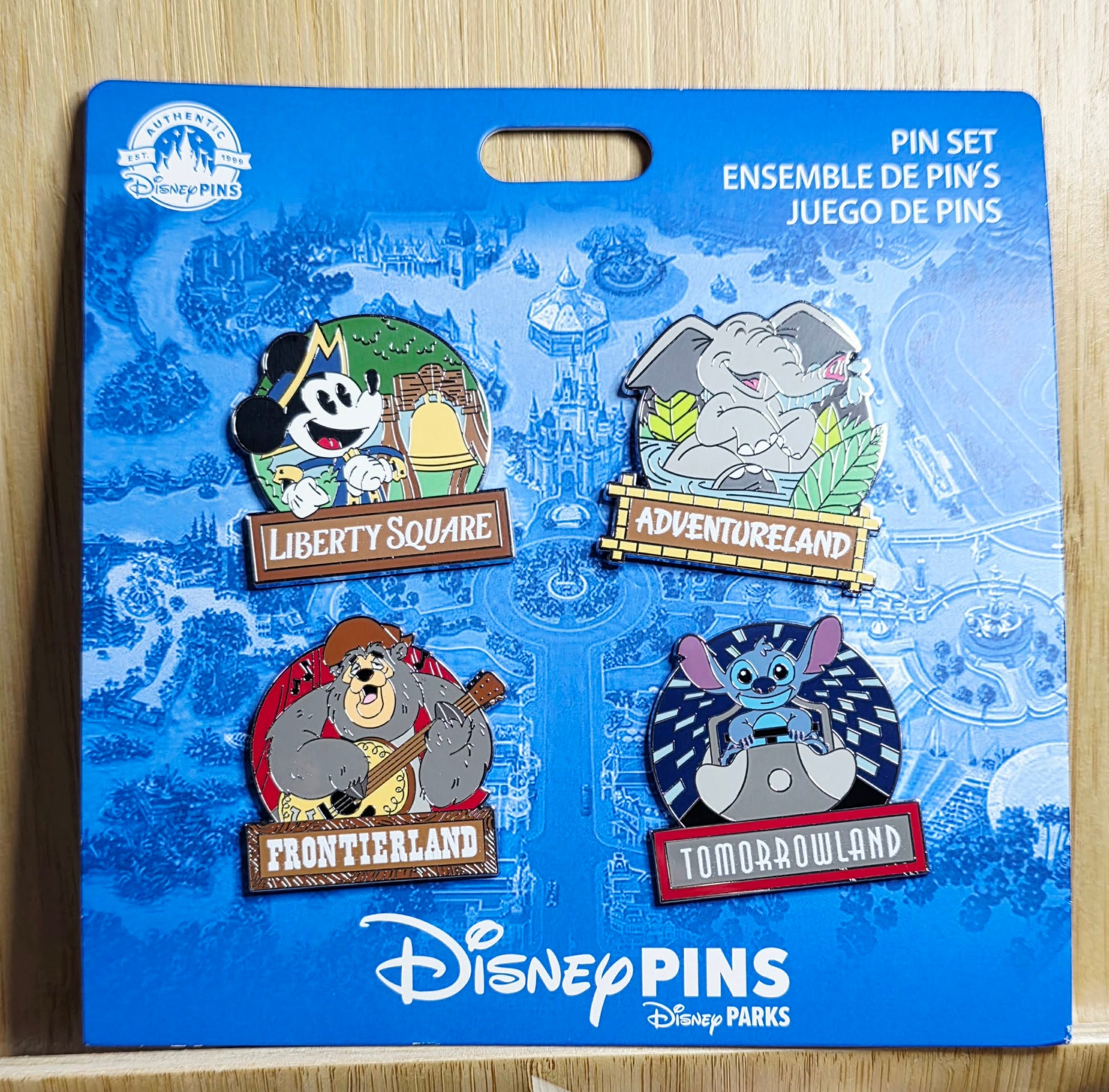 Disney Parks Magic Kingdom Booster 4 Pin Set, released in 2024. The set features characters and themes representing different lands within the Magic Kingdom park: