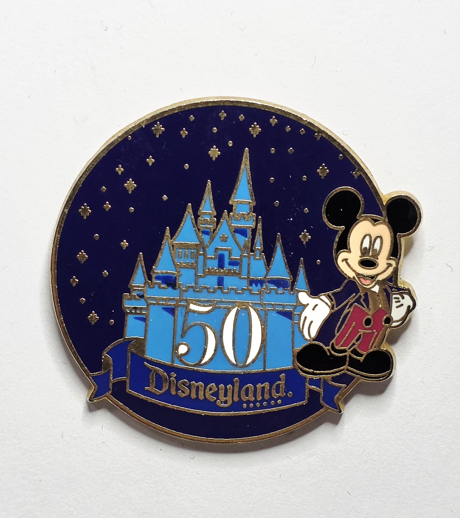 The pin features Mickey Mouse in a red vest next to a blue Sleeping Beauty's Castle with the number "50" in the center.
