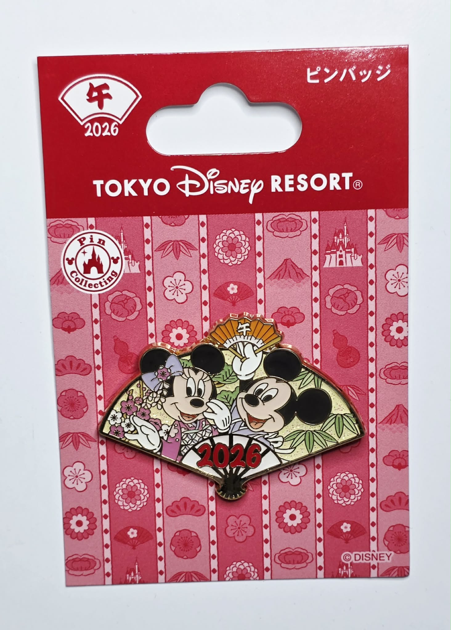 2026 Tokyo Disney Resort Happy New Year pin featuring Mickey and Minnie Mouse in traditional kimono costumes on a Japanese fan design.