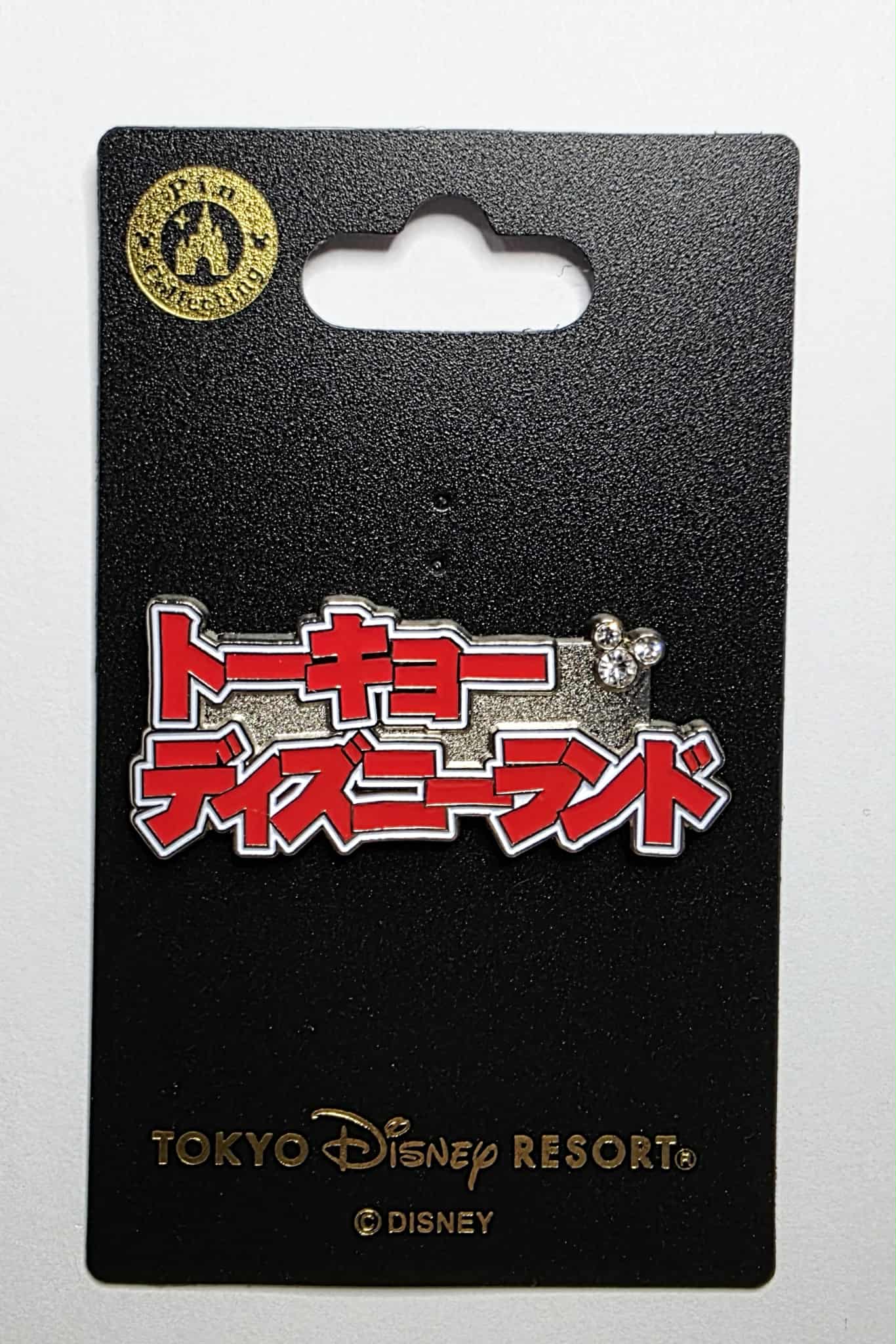 Tokyo Disneyland pin featuring the park's name in Katakana Japanese with a jeweled Mickey Mouse icon