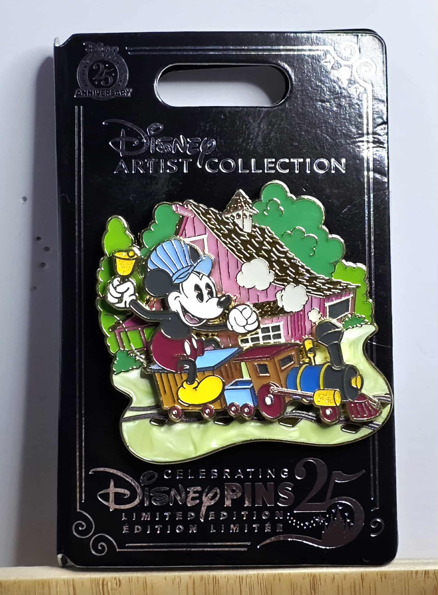 2025 Disney Parks Artist Collection Alex Maher Classic Mickey Train Pin. This is a limited edition collectible pin featuring Mickey Mouse riding a train, designed by artist Alex Maher.
