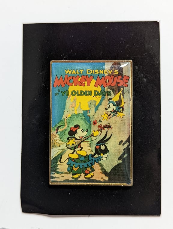 UniQlo Japan has collaborated with Disney and released several vintage looking poster pins from various Disney movies. The pins were part of a bundle shaped like a book from each film. In the "book" was a t-shirt and pin. Here is the poster for Ye Olden Days (1933). In the film, the king locks up his daughter, Princess Minnie, when she refuses to wed a dippy prince. Mickey Mouse, a wandering minstrel, comes to the rescue. Here is Mickey serenading Princess Minnie.