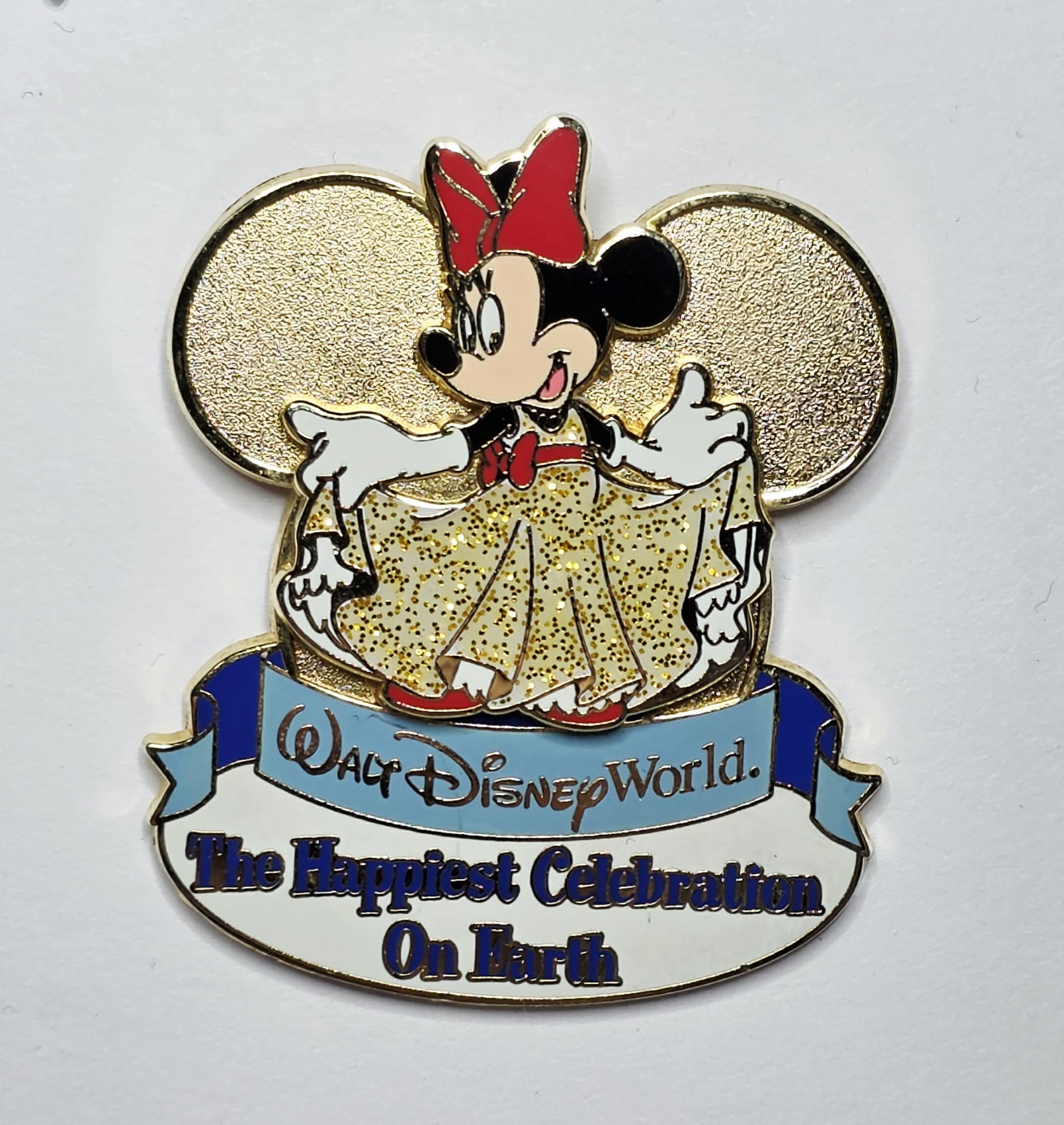 Walt Disney World Minnie Mouse pin from "The Happiest Celebration on Earth" event. The pin features Minnie Mouse in a golden, glittery ballgown with a red bow in her hair and red shoes.