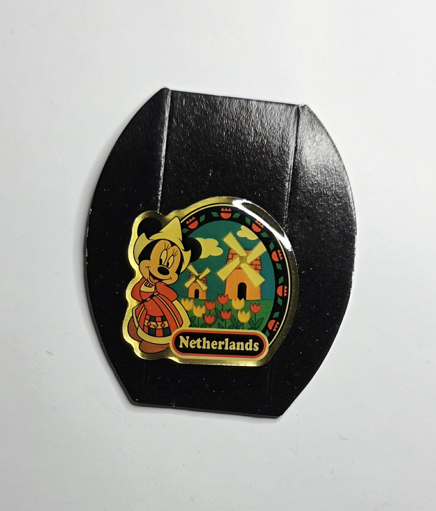 Minnie Mouse pin from the Morinaga World Travel Collection. This specific pin represents the Netherlands, featuring Minnie in traditional attire with windmills and tulips in the background.