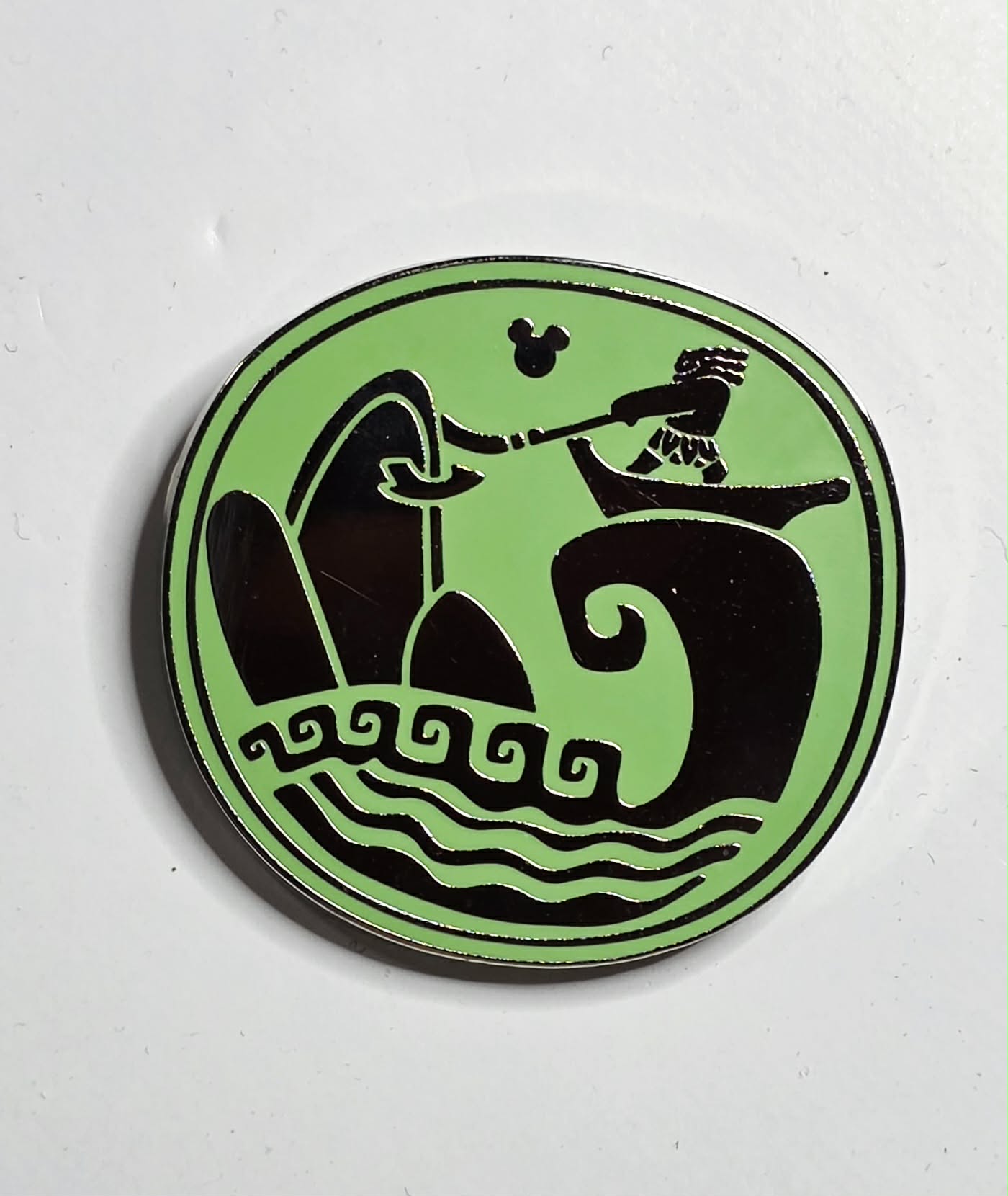 It features a silver silhouette of Maui from the movie Moana on a bright green background.