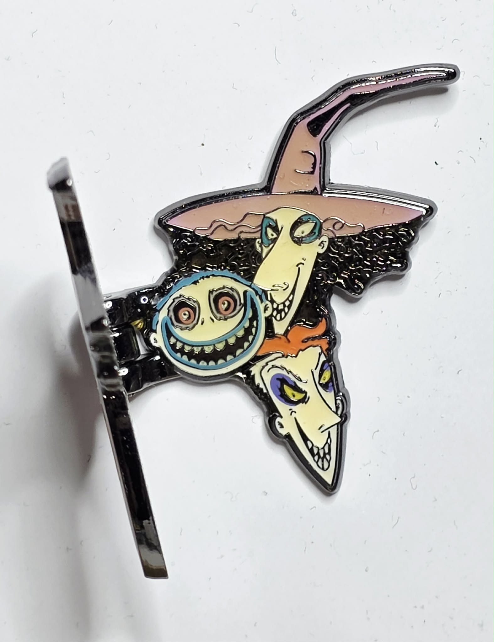 The Nightmare Before Christmas Oogie's Boys Hinge Enamel Pin, which features the characters Lock, Shock, and Barrel in their masks. The pin is a hinged design, and opening it reveals the characters' faces without their masks underneath.
