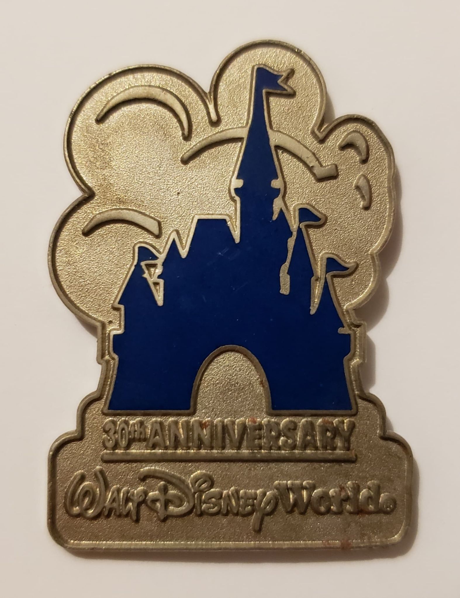 This pewter pin shows a blue Cinderella's castle against a Mickey head shaped cloud. At the bottom it says 30th Anniversary Walt Disney World. Many of these pins were scratched so they were re-made and rereleased in September.
