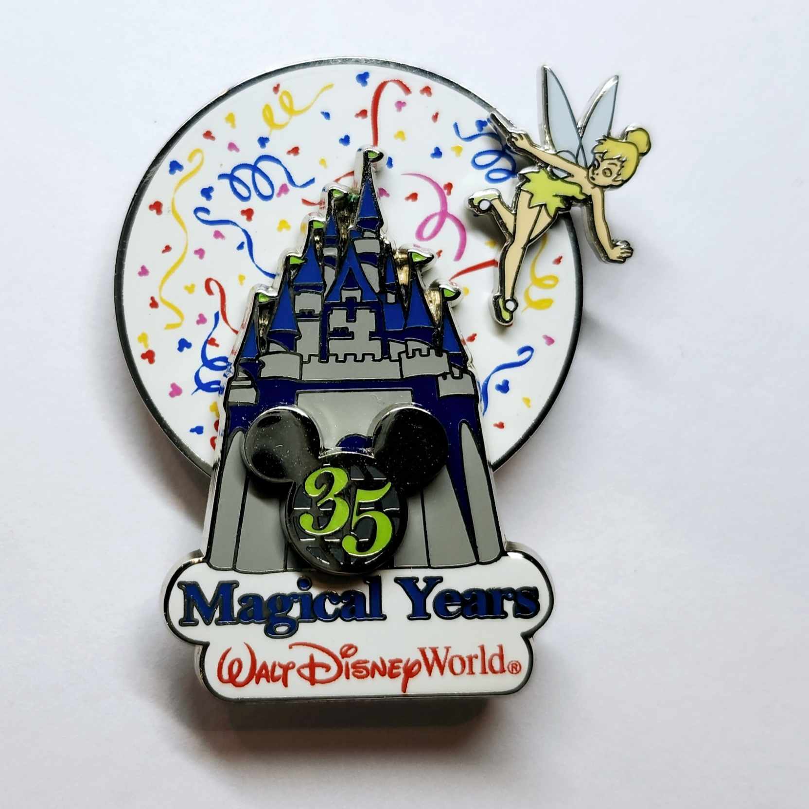Tinker Bell celebrates 35 Magical Years at Walt Disney World ® Resort in this Open Edition pin. This pin features both pin on pin and spinning elements. This is a five (5)layer pin. The first layer consists of the back of the pin with a single stake. The second layer is Tinker Bell on a sliding arm that is formed around the third layer. The third layer is a spinning disc featuring multi-colored confetti streams and hidden Mickey heads on a white background. The colors are blue, pink, orange and yellow. Tinker Bell, with her wand, slides across the top. The fourth layer is Cinderella's castle in gray with blue spires. Beneath the castle, written in blue is, "Magical Years". Beneath this is written, "Walt Disney World®", in red. The fifth layer is a silver Mickey head with, "35" written in green