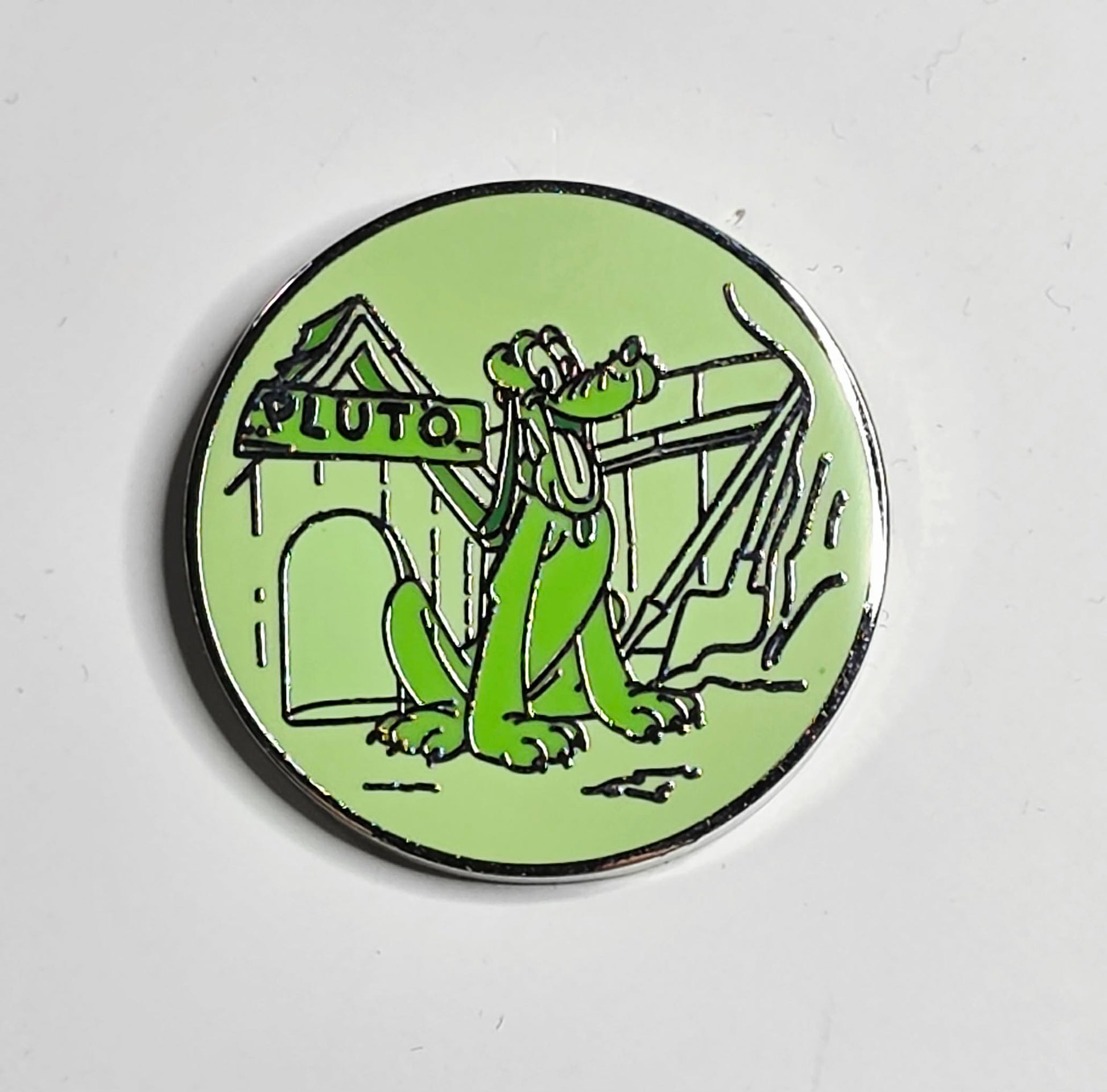 It depicts Pluto sitting in front of his doghouse, which has a sign that reads "PLUTO".