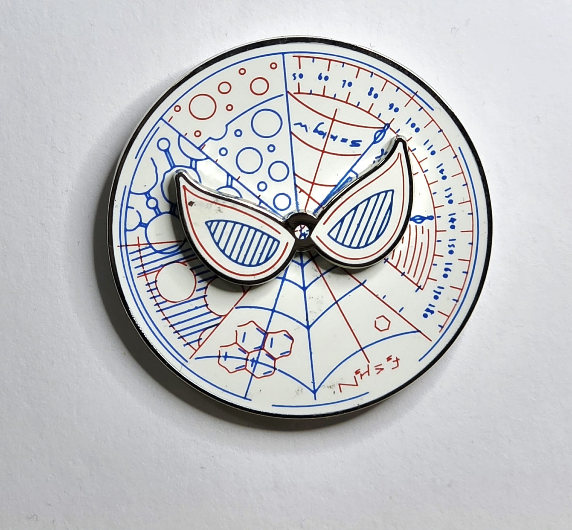 Spider-Man spinner pin. The pin features Spider-Man's mask over a scientific/engineering diagram background