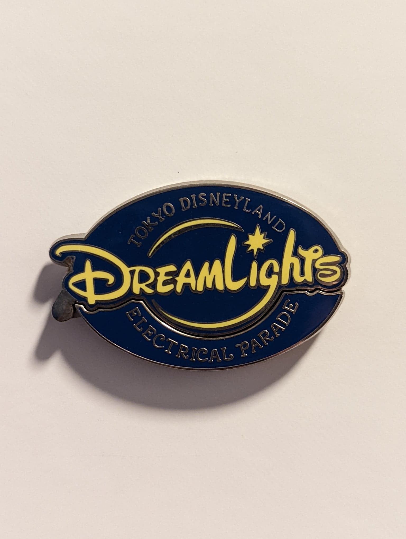 An oval shaped pin it says "DreamLights" across the front with "Tokyo Disneyland" written above and "Electrical Parade" written below. The top half opens to reveal Mickey & Minnie Mouse riding on the train float in the parade.