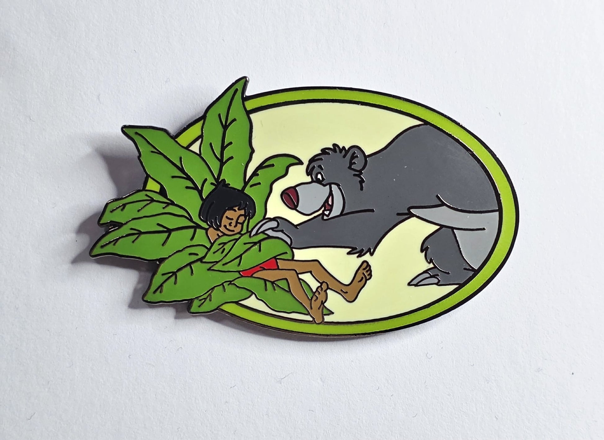 Baloo and Mowgli from the animated classic The Jungle Book. The scene depicted is Baloo covering a sleeping Mowgli with leaves.
