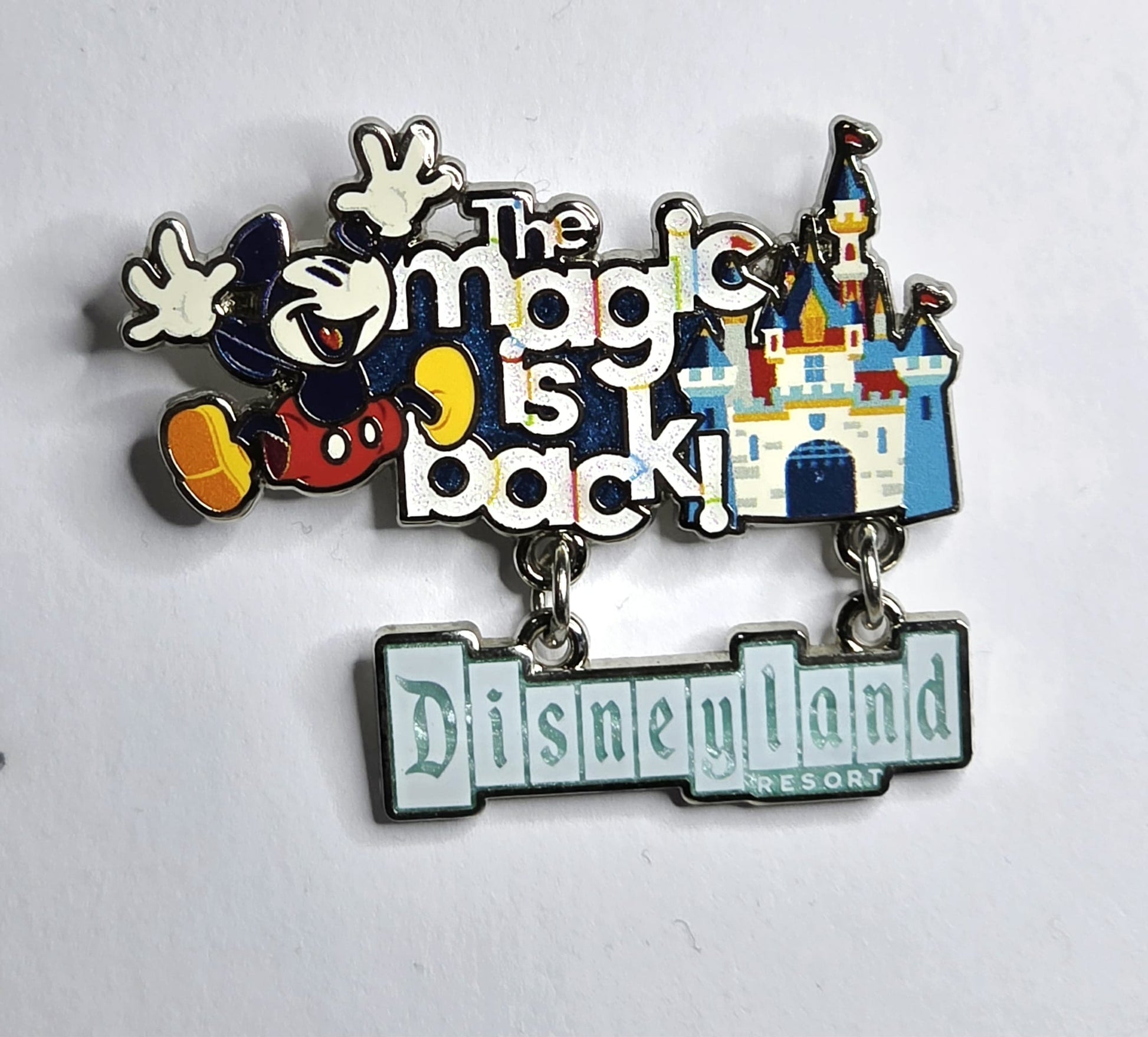 Disneyland Resort "The Magic Is Back!" limited release pin. This pin was part of merchandise released to commemorate the reopening of the parks after the COVID-19 closure in 2021.