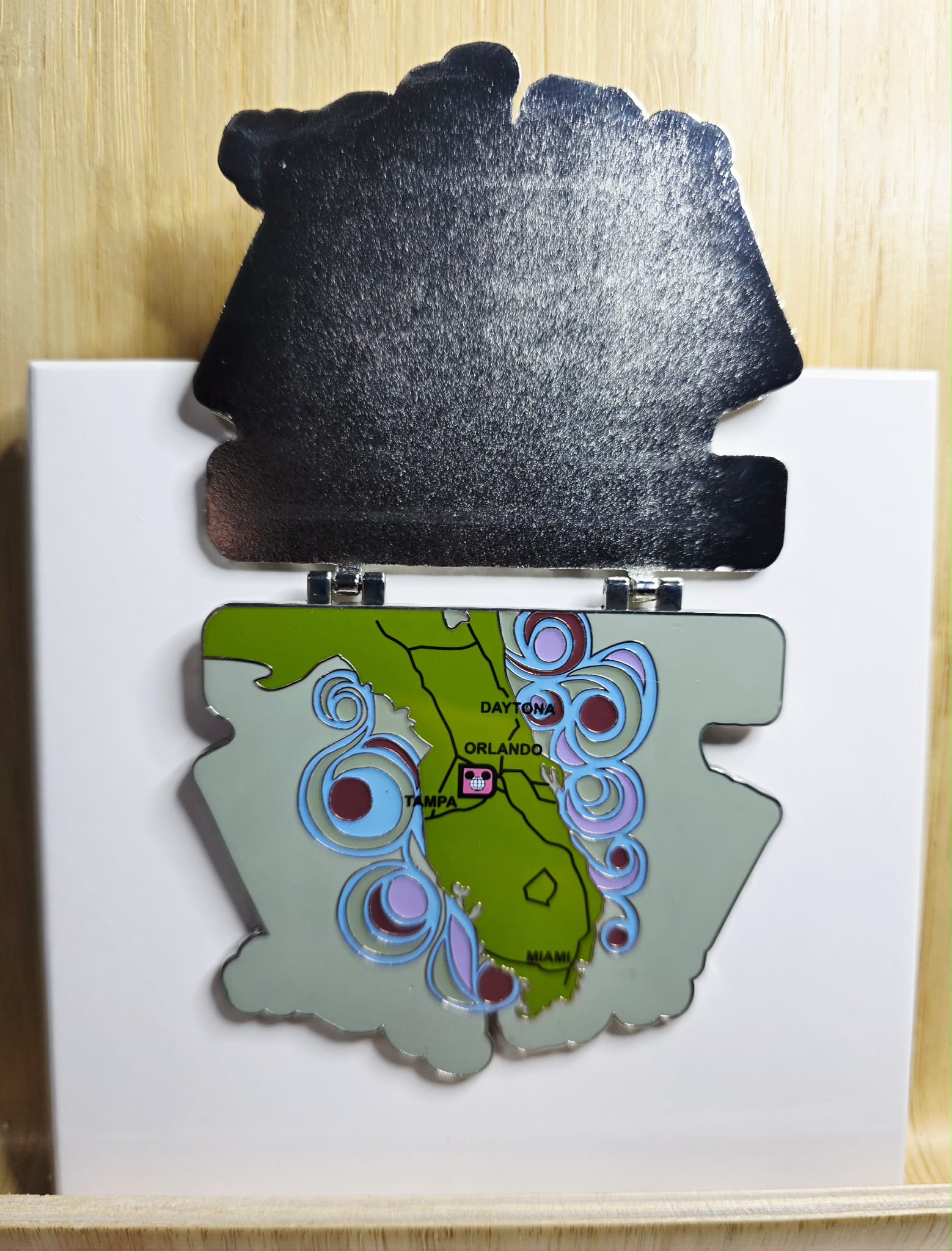 The pin features a hinged element that opens to reveal a scene inside with various Disney characters.
