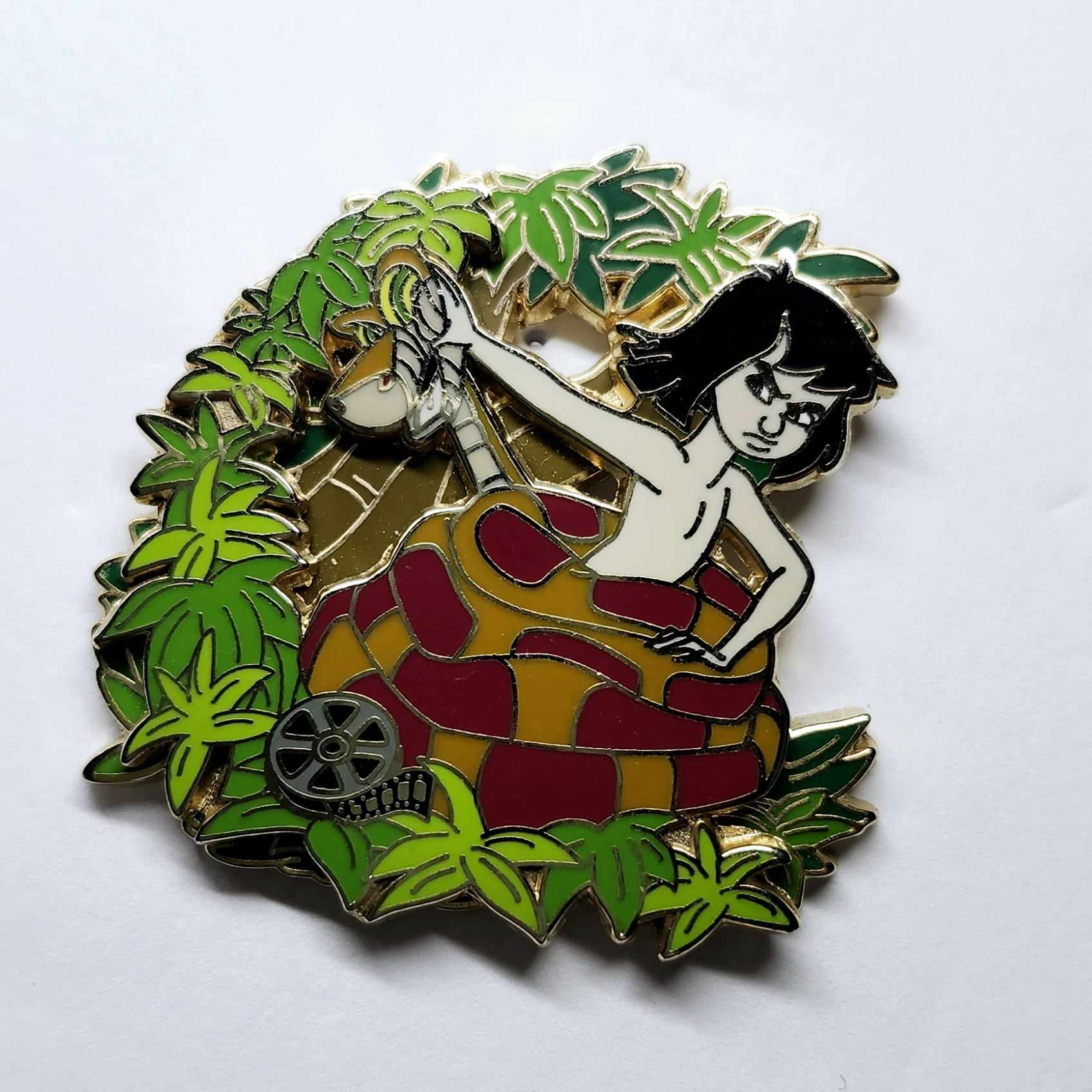 Walt Disney's greatest moments in animation come to life in this pin-of-the-month series! Each month four Limited Edition pins will be released highlighting a different classic animated short or film. Each pin in the collection features an icon of a reel of flim in the corner. The December collection salutes the classic animated film Walt Disney's The Jungle Book and features four limited edition pins. This pin features Kaa the snake spiraled around Mowgli. Mowgli is pushing away Kaa's head.