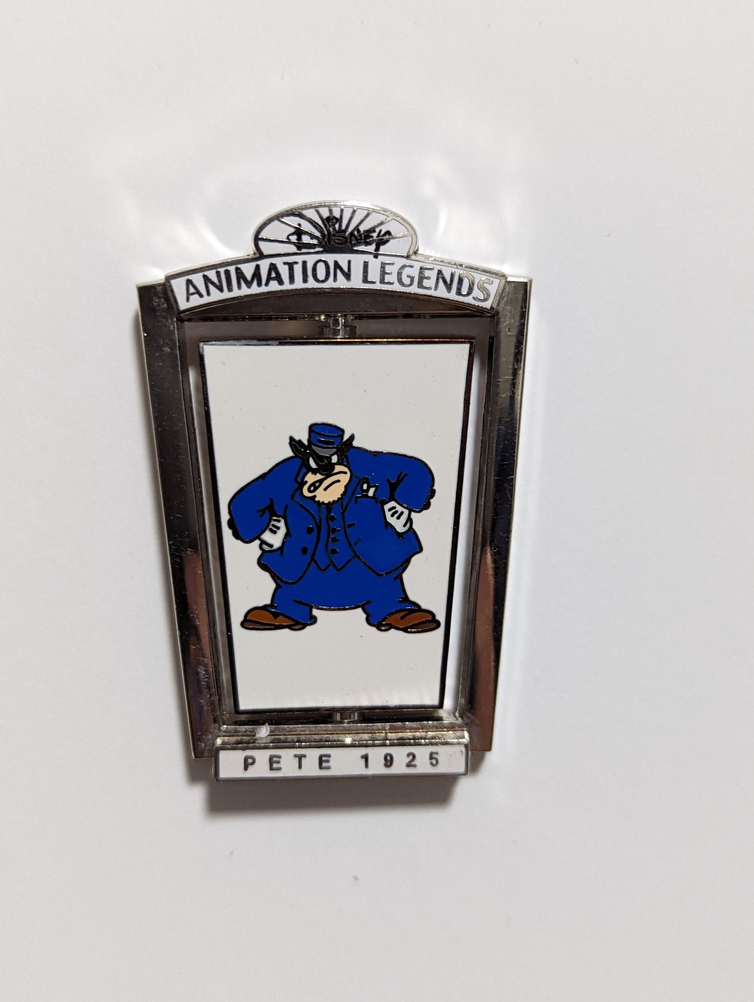 This pin is the seventh in a series of 12 Animation Legends pins being release at Walt Disney World. It is the July Pin of the Month. It is of the Evil Villain Pete, in a blue suit and top hat with his hands on his hips looking very mad. The words Pete 1952 underneath him. This pin is similar to the other flipper/spinner pins in that it flips/spins around to show a black and white sketch on one side and a color picture on the other.