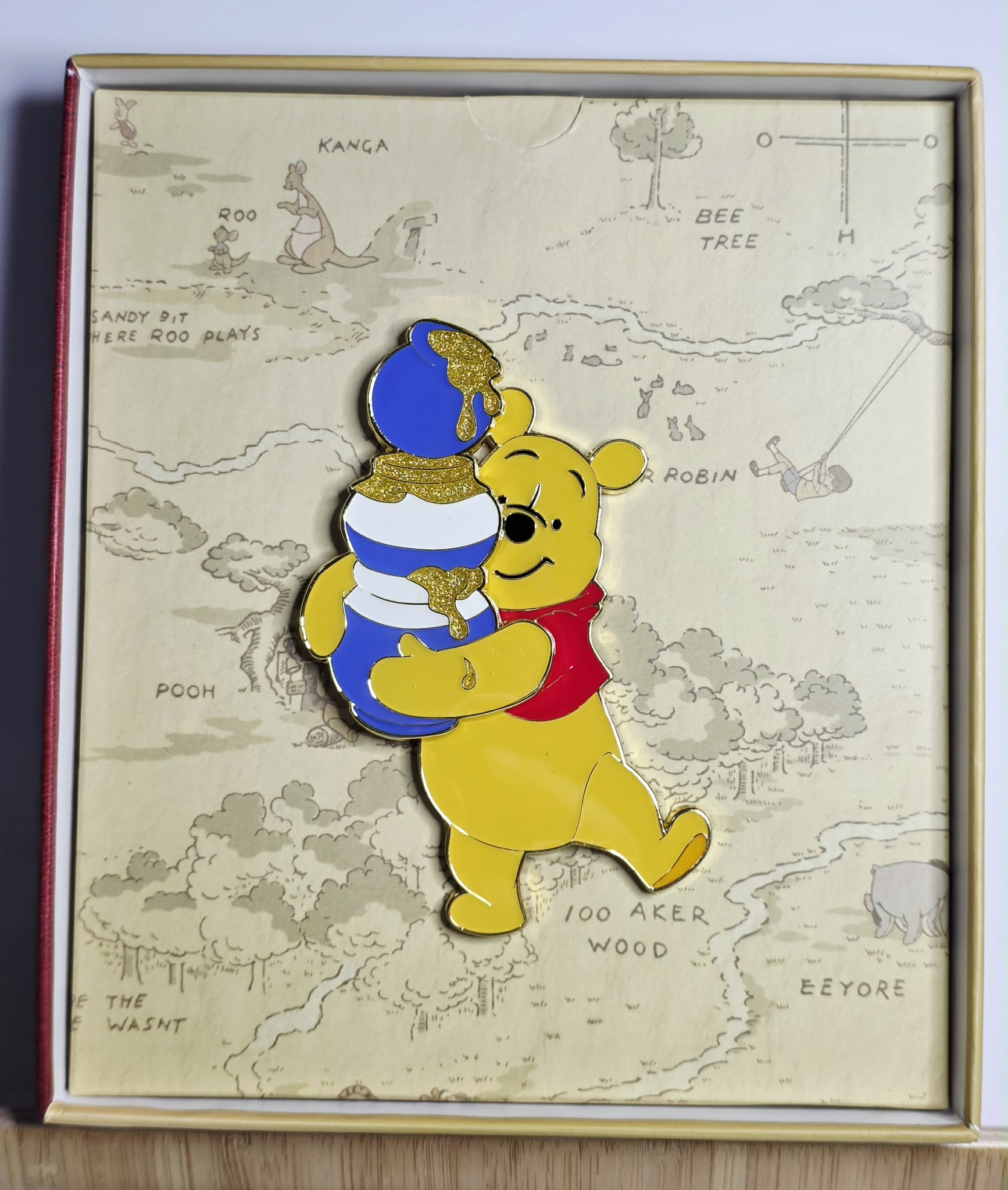 The pin features Winnie the Pooh holding a blue honey pot with glittery honey details