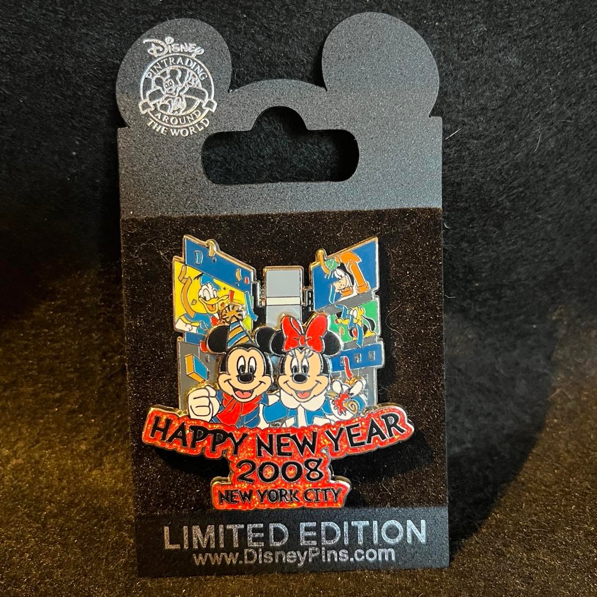 Mickey and Minnie Mouse at Times Square during New Year's Eve. The base pin from left to right has a large yellow TV screen with Donald Duck on it, the middle has a grey highrise building, and the right has two screens one above the other. The top screen has Goofy and the bottom screen has Pluto on it. Mickey and Minnie are on the top pin, each with one arm around the other. Mickey is wearing a New Year's party hat, a red scarf, green jacket and white gloves. Minnie is standing to his left wearing a red bow in her hair, a white and blue jacket and white gloves. Minnie is holding a noise maker in her left hand. Under Minnie & Mickey is a three line banner that reads: Happy New Year, 2008, New York City.